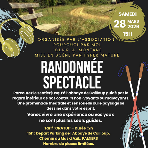 « Parcourez le sentier jusqu’à l’abbaye de Cailloup guidé par le regard intérieur de nos conteurs non-voyants ou malvoyants. Une promenade théâtrale et sensorielle où le paysage se dessine dans votre esprit. »