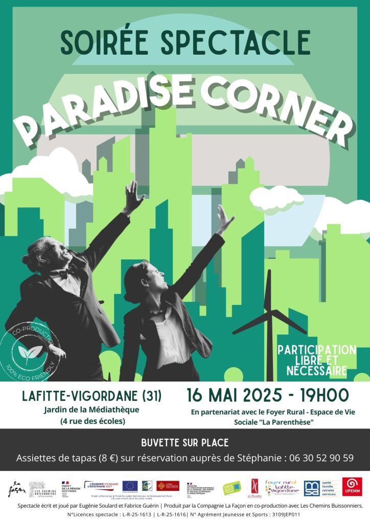 – 16 mai 2025 à 19h00 : représentation de Paradise Corner à Lafitte-Vigordane en partenariat avec le Foyer Rural – Espace de Vie Sociale « La Parenthèse ».
